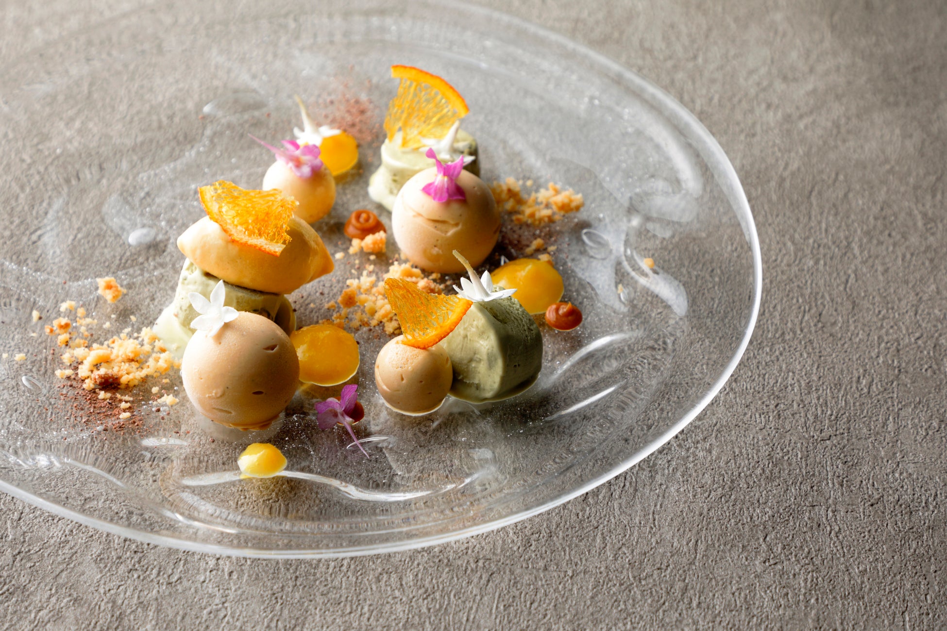 オレンジが香るアイス仕立てのキャラメルピスターシュ。キャラメルのコクとオレンジの酸味に、アクセントで黒胡椒を添えた、華やかなデザートです。