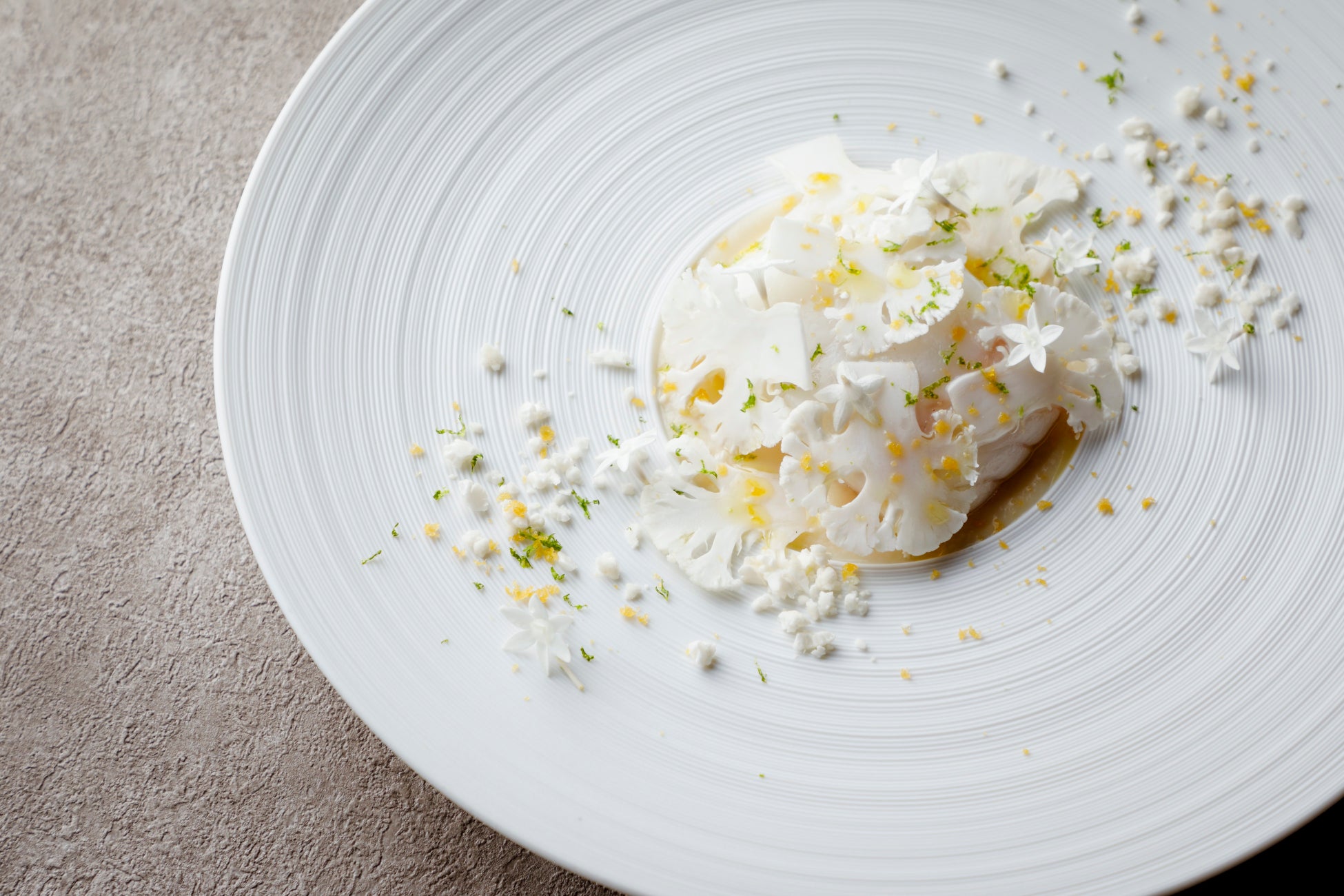 粉雪の舞う冬の雪景色をイメージした一皿。ふっくらと低温調理で柔らかに蒸した平目は、旬を迎えるカリフラワーの甘み広がる滑らかなピュレと、程よい塩味の唐墨と一緒にお召し上がりください。