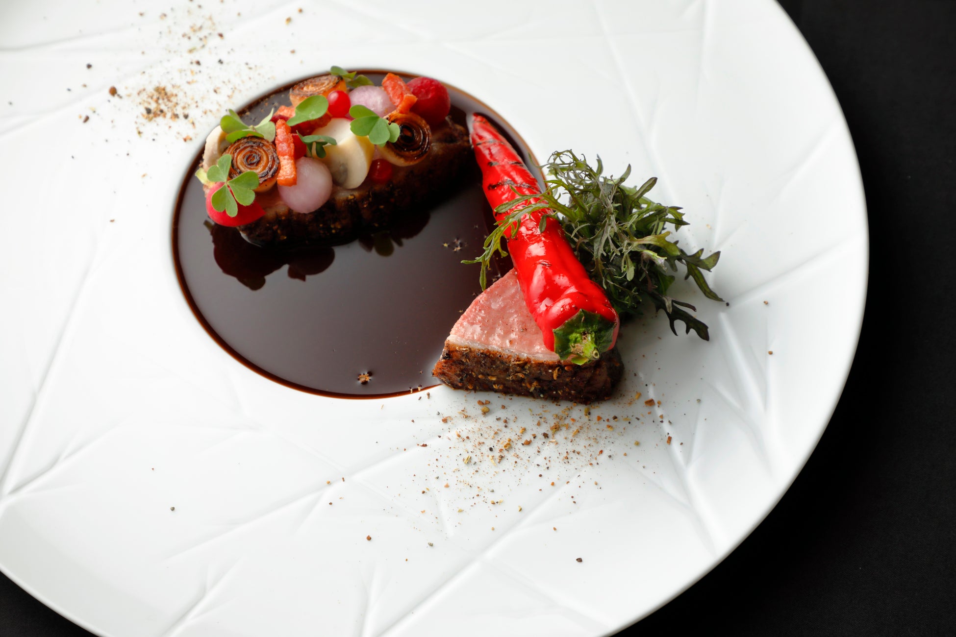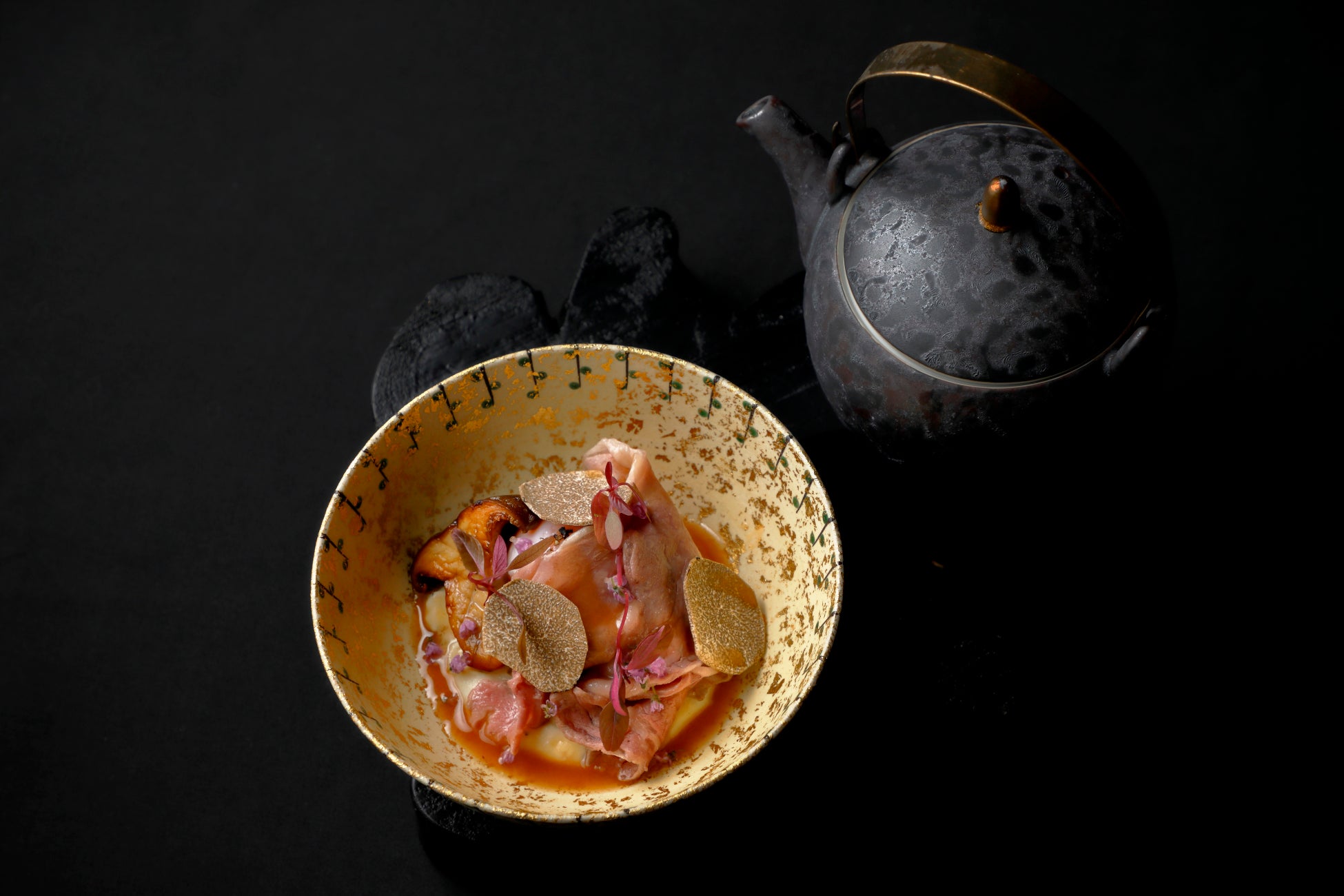 柔らかな国産牛ロースにさっと火を通し、トリュフで香り付けしたポテトピュレ、大黒本しめじを重ね、和風テイストのグレイビーソースを注いで完成する、まるで肉じゃがを連想するような一皿です。