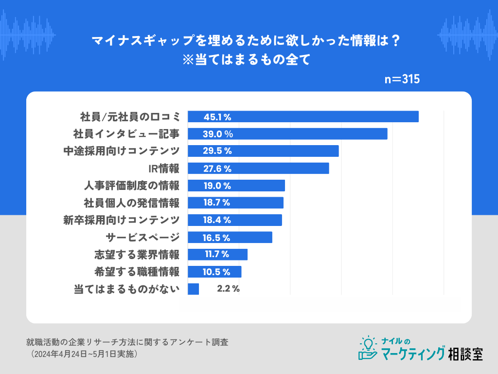 入社後にマイナスギャップを感じたと回答した315名に、ギャップを埋めるために欲しかった情報を聞いたところ、1位は「社員/元社員の口コミ(45.1%)」2位「社員インタビュー記事(39%)」、3位「中途採用向けコンテンツ(29.5%)」でした。