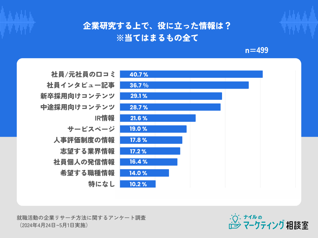 続いて、企業研究する上で参考になった情報について聞くと、1位は「社員/元社員の口コミ(40.7%)」、2位「社員インタビュー記事(36.7%)」、3位「新卒向けコンテンツ(29.1%)」でした。