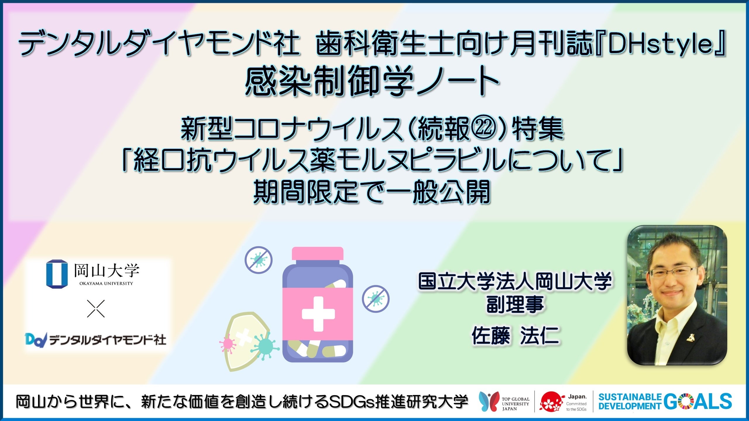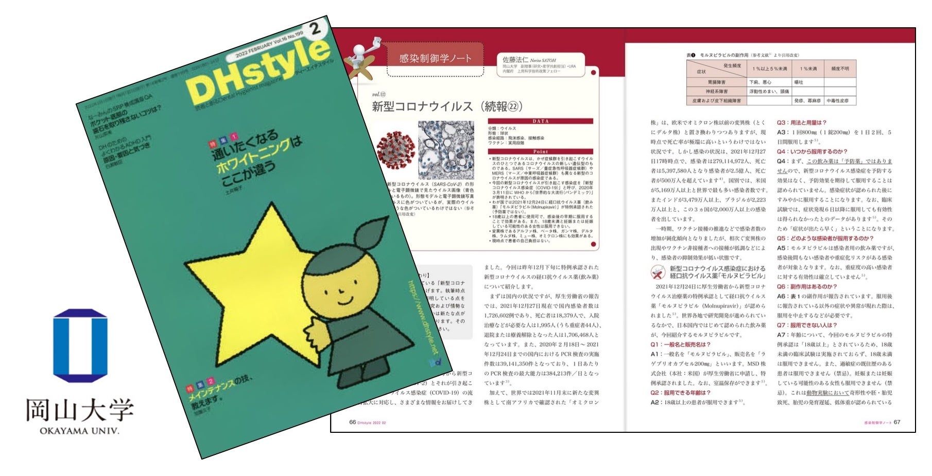 歯科総合出版社デンタルダイヤモンド社が発行している歯科衛生士向け月刊誌『DHstyle』に連載中の「感染制御学ノート」の新型コロナウイルス特集ページ(続報22)「抗経口ウイルス薬モルヌピラビル(商品名:ラゲブリオ)について」を期間限定で一般公開中です!