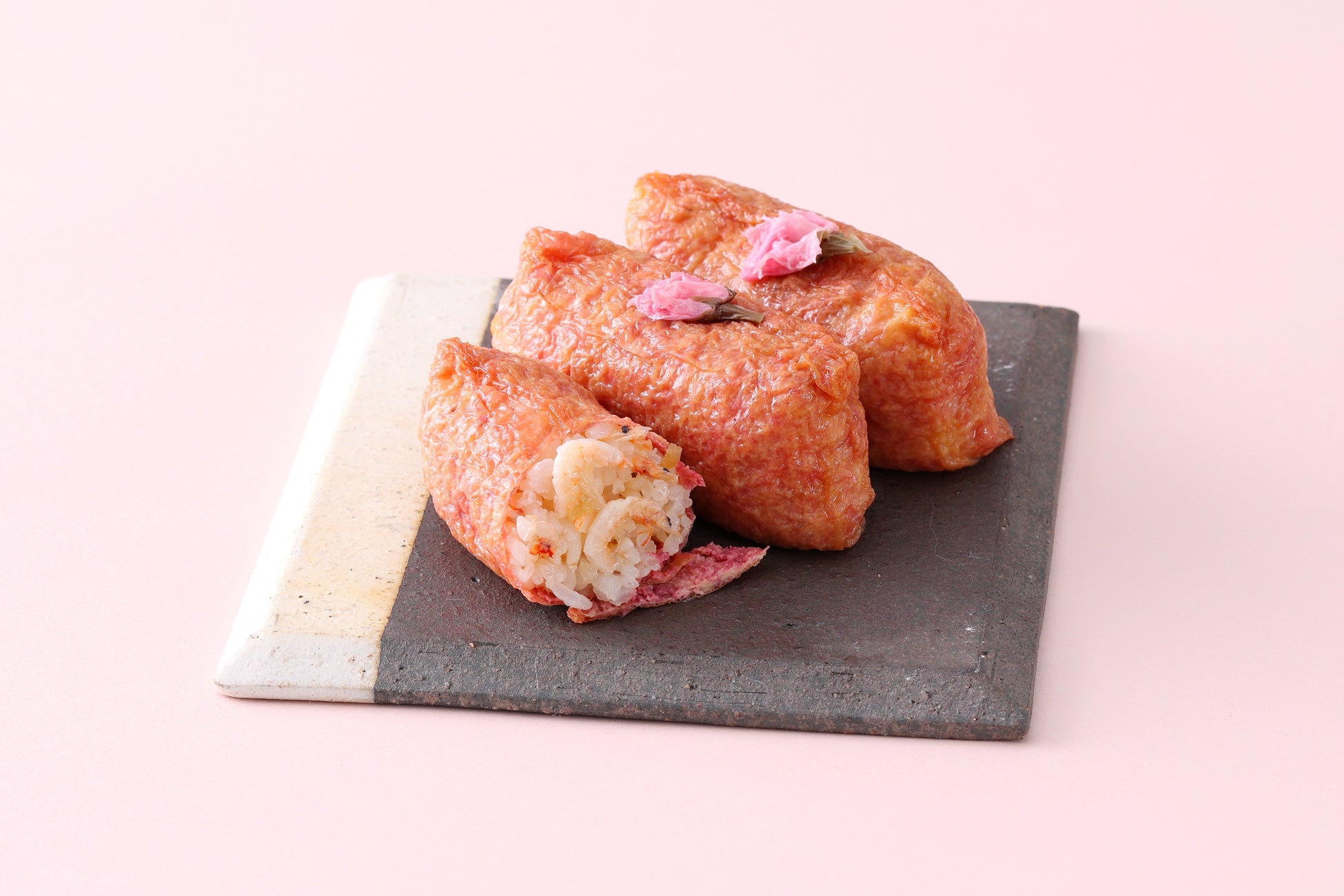 桜風味ピンクの揚げのおいなりさんに桜の塩漬けをあしらった春らしい人気商品。中の桜エビの旨味と香りも絶妙です。