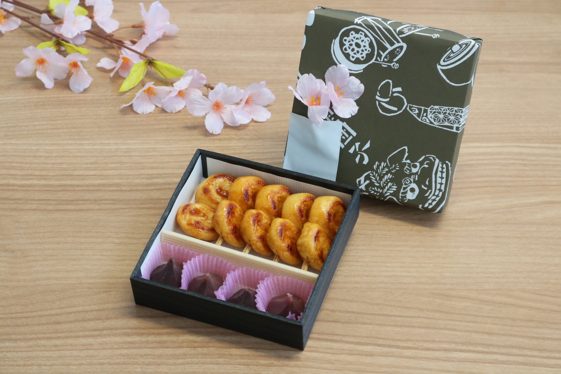ミニ焼き団子と一口サイズのあん団子の詰合せ。紙製のお重の容器に入っているので、そのままお花見で広げてお楽しみ頂けます。可愛らしい桜の飾りもついております。