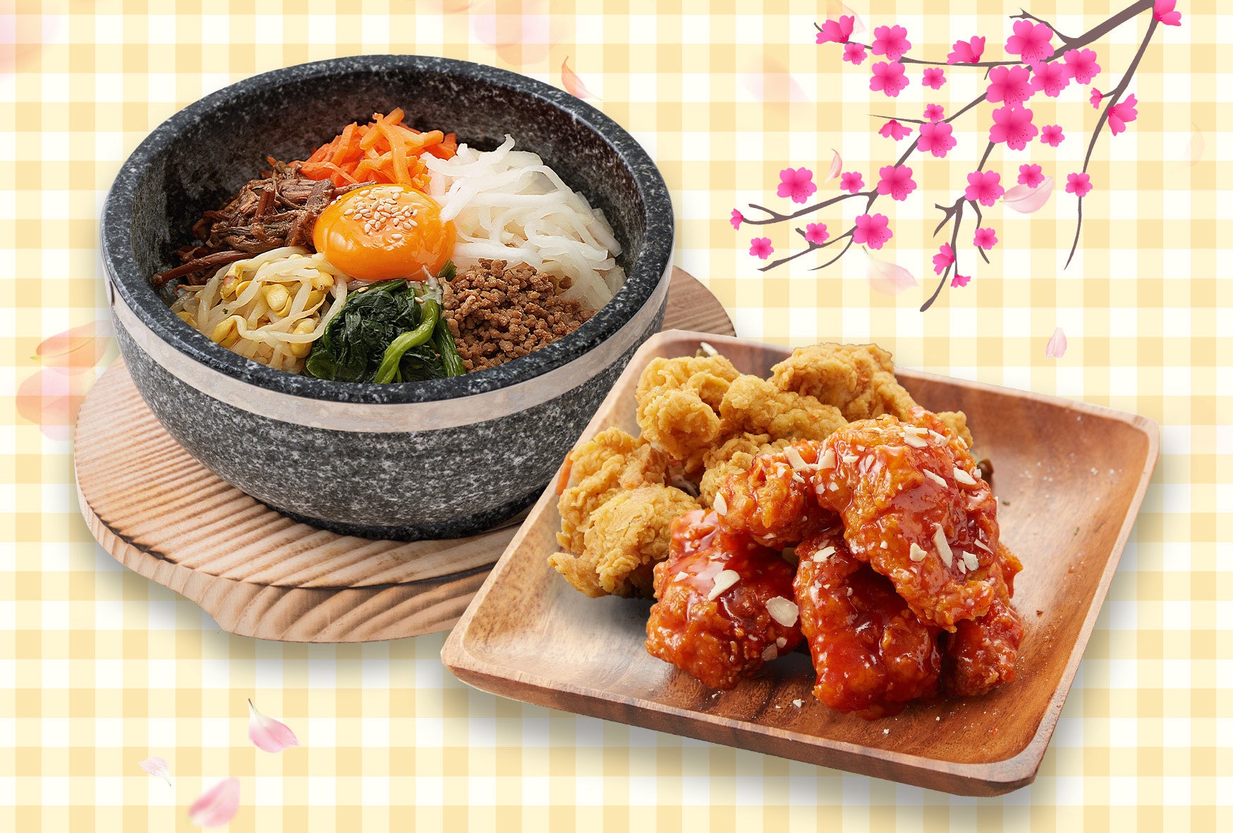 定番商品のビビムパとザクザク食感で人気の韓国チキン、チーズボールが楽しめるセットです。