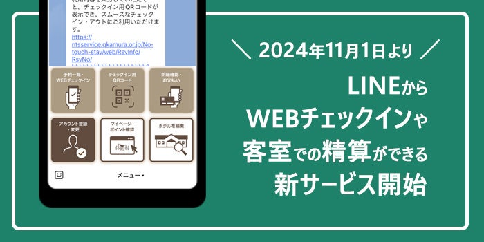全国の国立・国定公園などのフィールドに35か所のリゾートホテルを展開している一般財団法人休暇村協会(所在地:東京都台東区東上野、理事長:小野寺 聡)は、DXによるお客様満足度の向上と、今後の働き手世代の減少を見据えた業務改善の両面を目的に、ホテル基幹システムとLINEを連携させてオンラインで事前にチェックインやホテル滞在中の精算を行うことができる新レセプションサービスを11月1日から運用を開始しました。