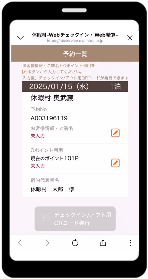 予約完了後~当日までの間、LINEからWEBチェックインを行うことができます。WEBチェックインでは、予約内容確認のほか、お客様情報の修正、電子署名、自社ポイントの利用が行うことができ、必要事項の入力が完了すると、チェックイン用QRコードが発行されます。