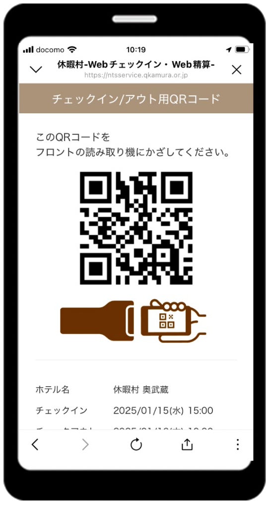 ホテルフロントではチェックイン用QRコードを読取機にかざすことでチェックインが完了します。