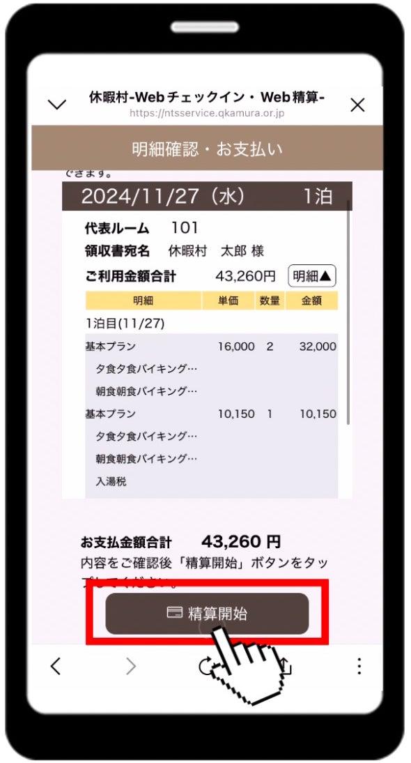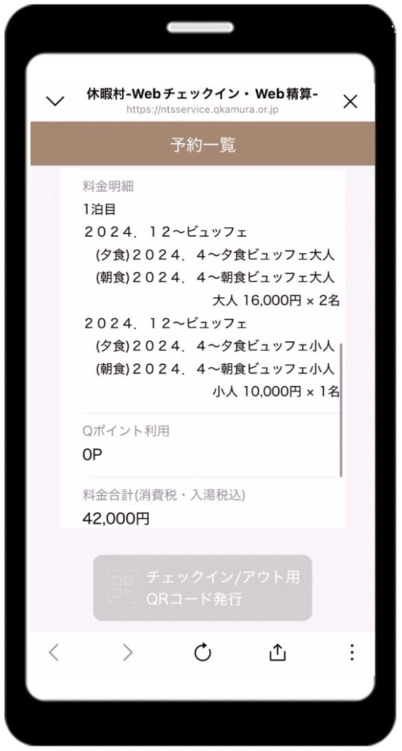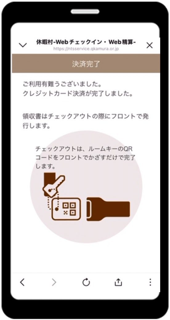 ホテル滞在中は、最新の利用代金をリアルタイムで確認可能で、予約時の宿泊代と滞在中に発生する売り掛けのご利用代金を合わせて、スマートフォン等お客様の端末からオンライン決済(WEB精算)が可能となります。