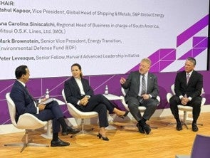 海運分野の脱炭素化に向けた解決策などについて議論する本セッションでは、南米事業統括のAna Carolina Siniscalchi が登壇し、当社の取組みとして「短期的にはLNG燃料船の導入拡大や風力補助推進システムであるウインドチャレンジャーの活用や効率運航の推進を通じて、温室効果ガス排出量および燃料消費量の削減を進めている」と述べました。また、海運業界が2050年ネットゼロ・エミッションを達成するために、アンモニア、メタノールなどのクリーンエネルギーについて船種、航路ごとに最適な燃料・技術を導入していくことを説明しました。