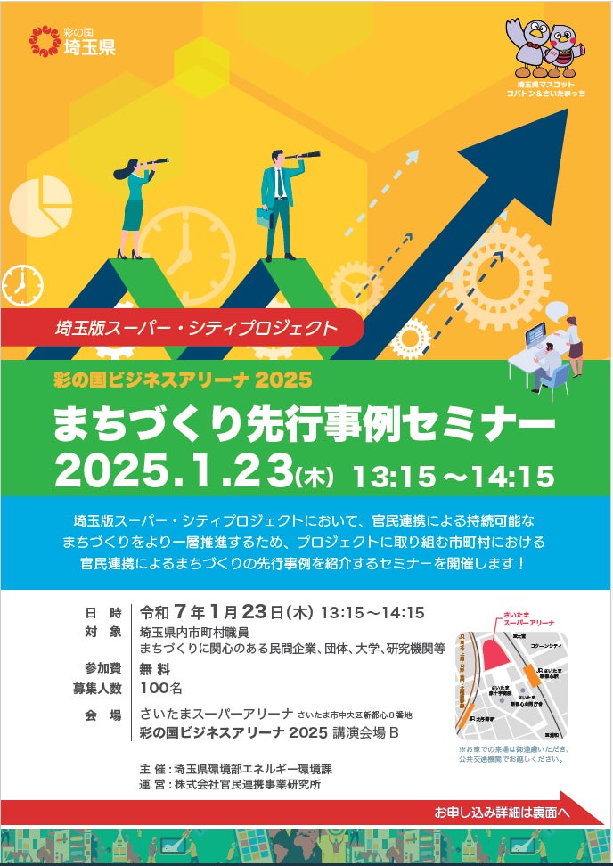 このたび、さいたまスーパーアリーナで開催されるビジネスマッチングイベント「彩の国ビジネスアリーナ2025」(以下「ビジネスアリーナ」という。)において、プロジェクトにおける官民連携によるまちづくりの先行事例を紹介する「まちづくり先行事例セミナー」を開催することとしました。