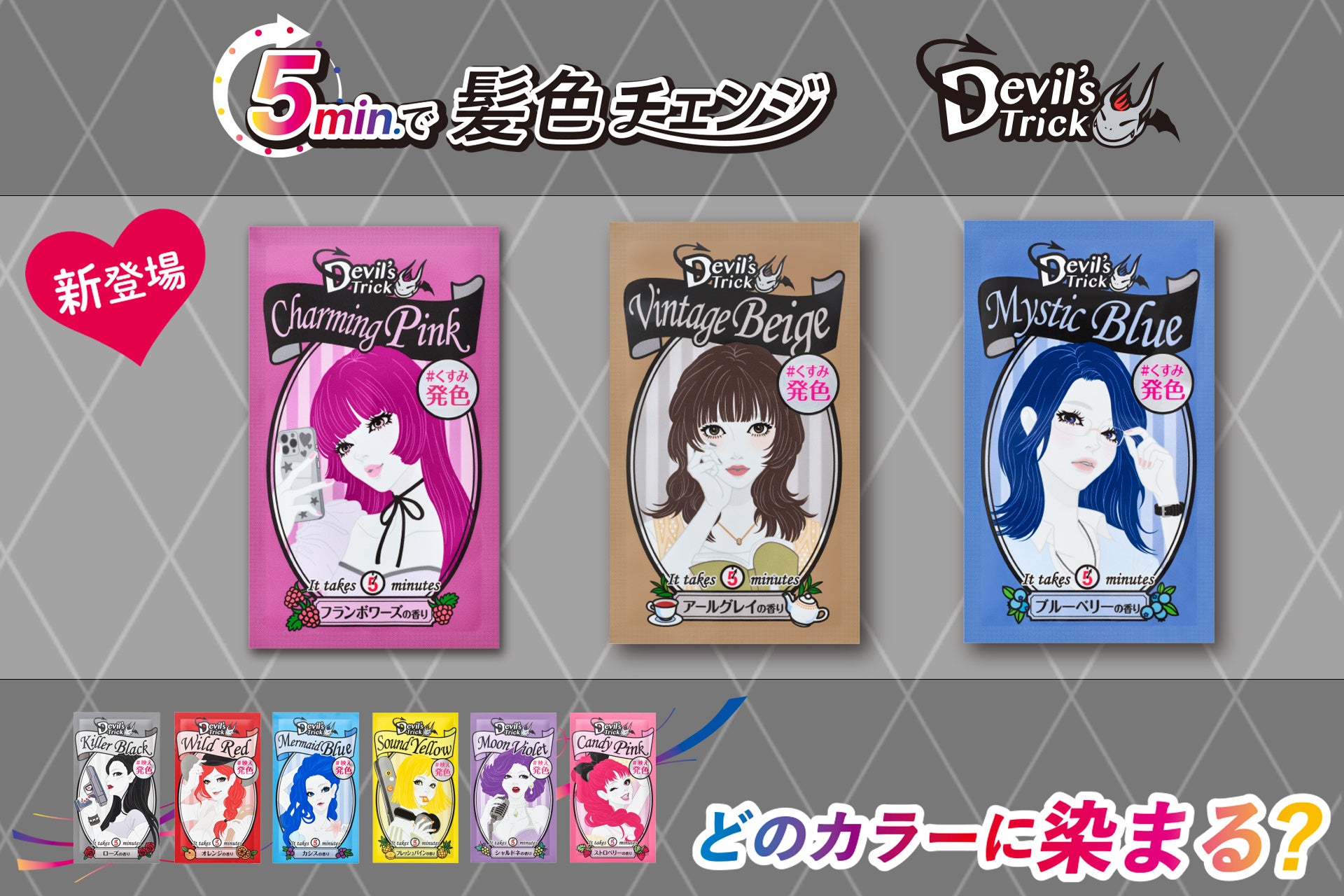 新登場の3色は既存のデビルズトリックのカラーを混ぜて作られています。『クイスクイス デビルズトリック』で髪色の着せ替えを楽しんでみませんか?