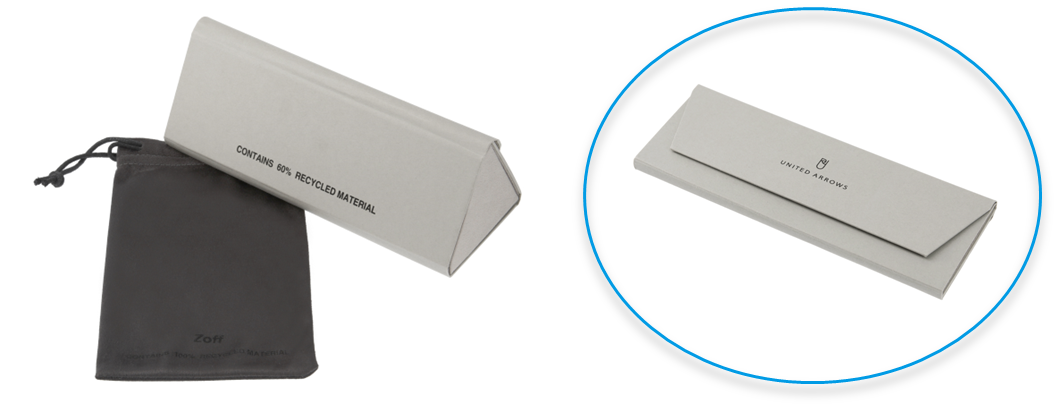 アイウェア、サングラス共通で、オリジナルメガネケースとメガネ拭きが付いてきます。ケースは60%、メガネ拭きは100%リサイクル素材を使ったサステナブルに配慮したセット。ケースは折りたたみ式になっており、巾着タイプのメガネ拭きと合わせて使い勝手のよい仕様です。