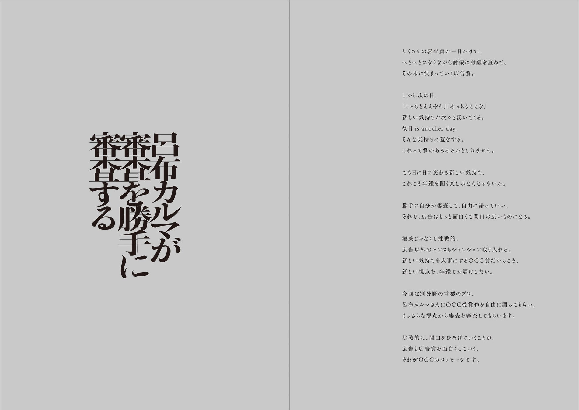 今年度のOCC賞でグランプリを受賞したACジャパン「寛容ラップ」のCM に出演していることから、ラッパーの呂布カルマさんに受賞作品を審査していただきました。OCC賞の作品についてや、広告やコピーについて、呂布カルマさんの視点によるコメントも読みどころです。
