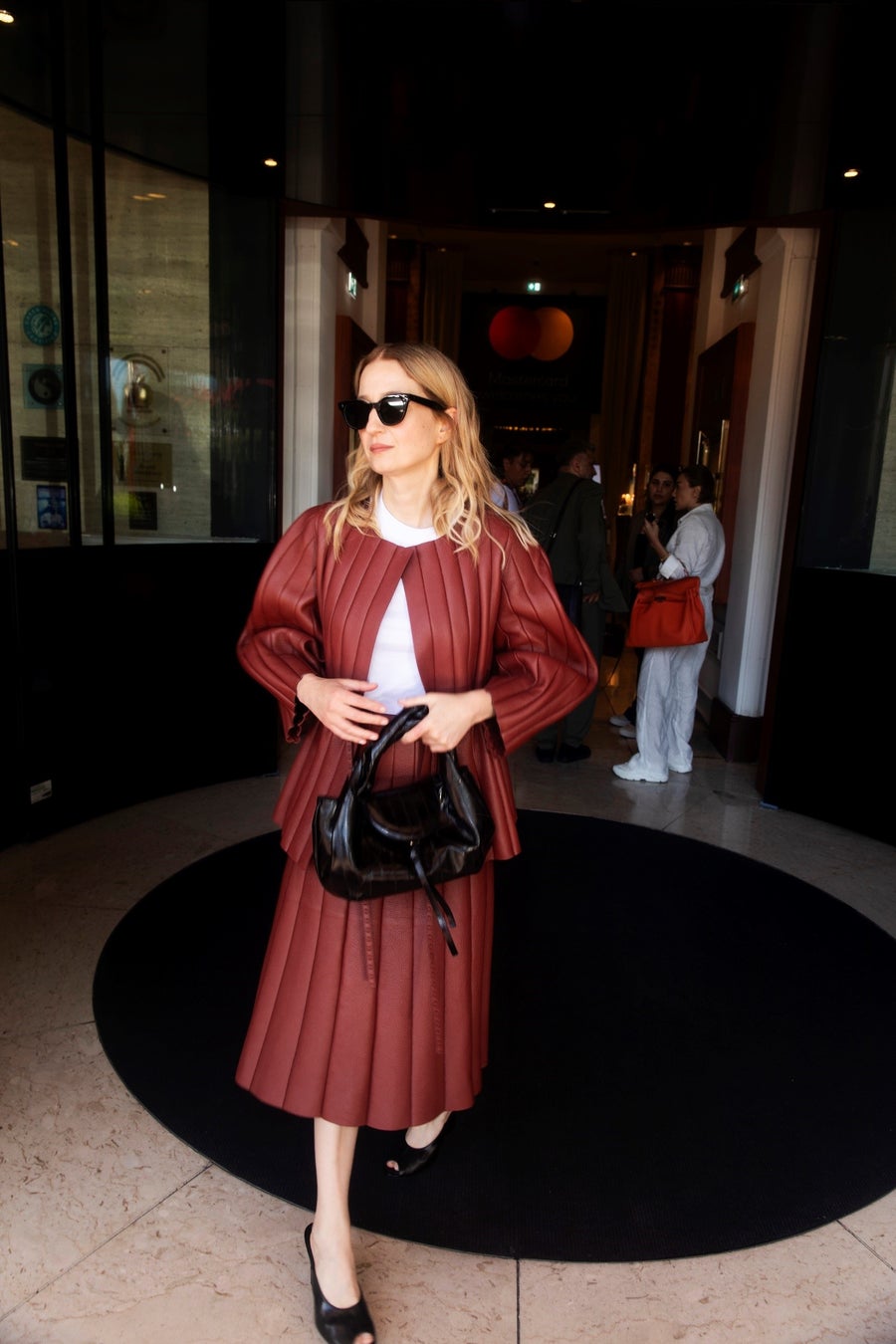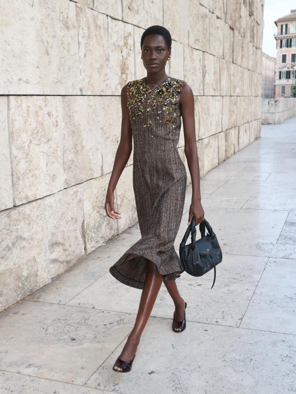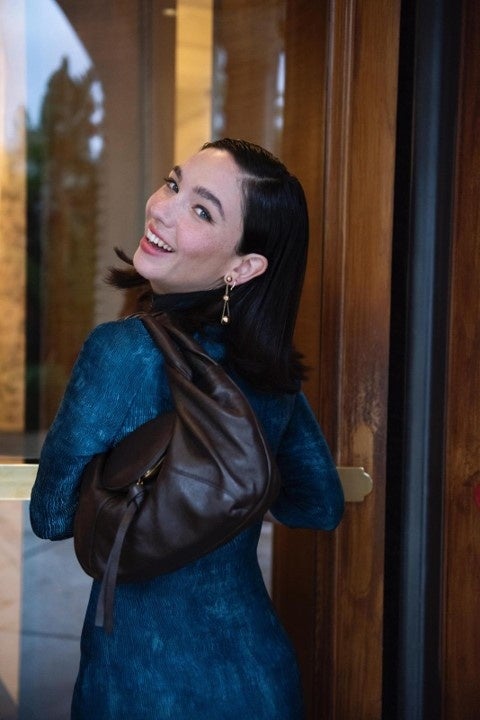 女優のマティルダ・デ・アンジェリスは、同イベントにて、ブラウンの「フェンディ スパイ」を着用。フェンディ2025-26年 秋冬コレクションのカラーパレットに登場する深みのあるブラウンは、モダニティを演出します。