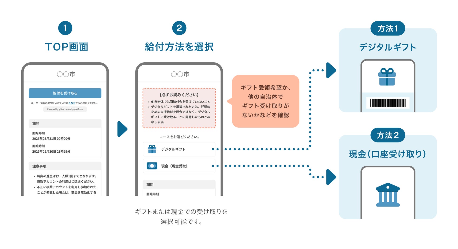 ギフティがご提供する給付システムは、給付対象者が給付内容(現金振込もしくはデジタルギフト)を選択できる仕様を実現しています。