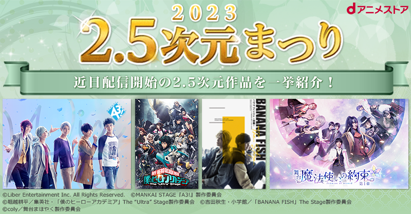 また、dアニメストアでは初の見放題作品となる舞台「Paradox Live on Stage」、 「僕のヒーローアカデミア」The “Ultra” Stage、 「BANANA FISH」The Stageをはじめ、 MANKAI STAGE『A3!』 、 など2.5次元作品を多数配信!今後も注目作品を続々と追加していきます。