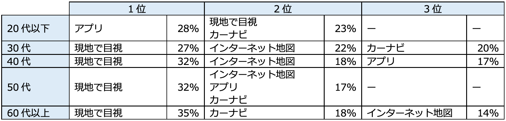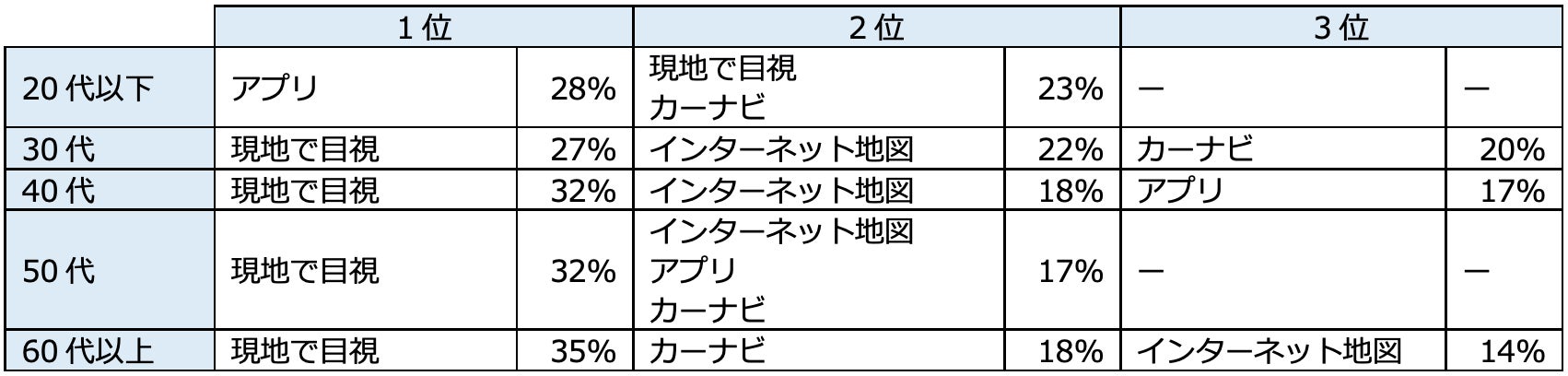 ③ 駐車場を探す手段、20代以下は「アプリ」、その他の年代は「現地で目視」が最多