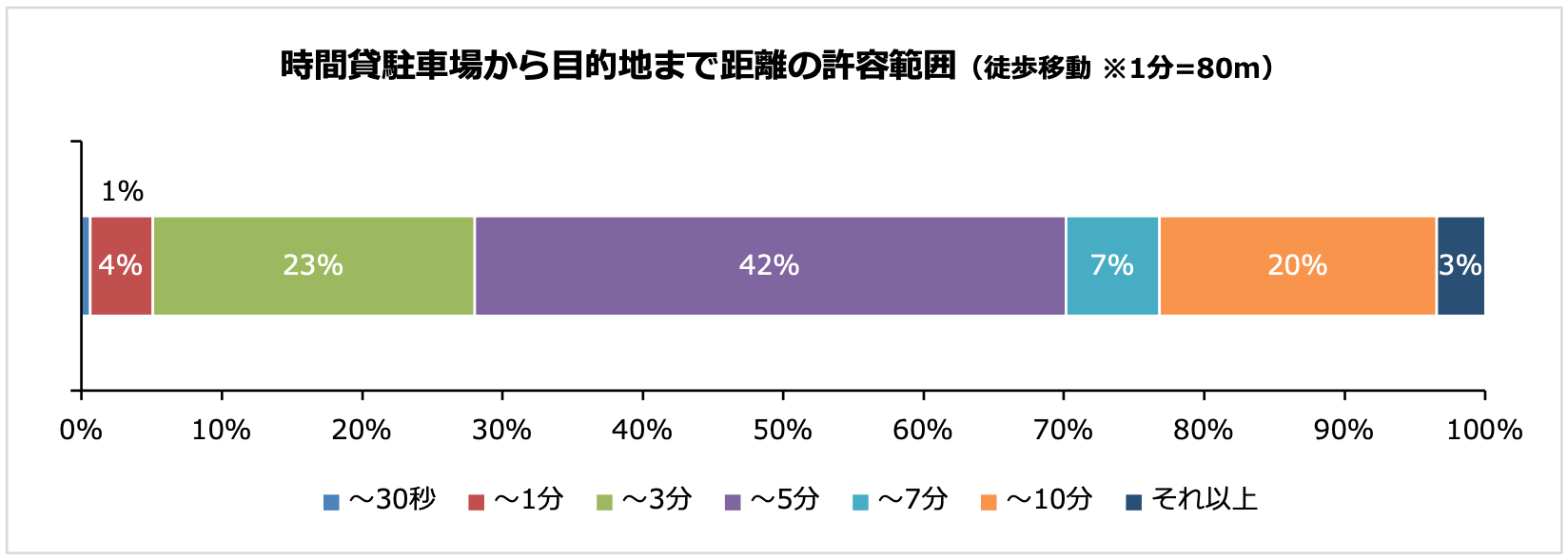 時間貸駐車場から目的地までの距離の許容範囲は、徒歩で「5分以内」が最多で4割を超えました。次いで、「3分以内」23%、「10分以内」20%という結果になっています。年代や性別による傾向の違いは見られませんでした。