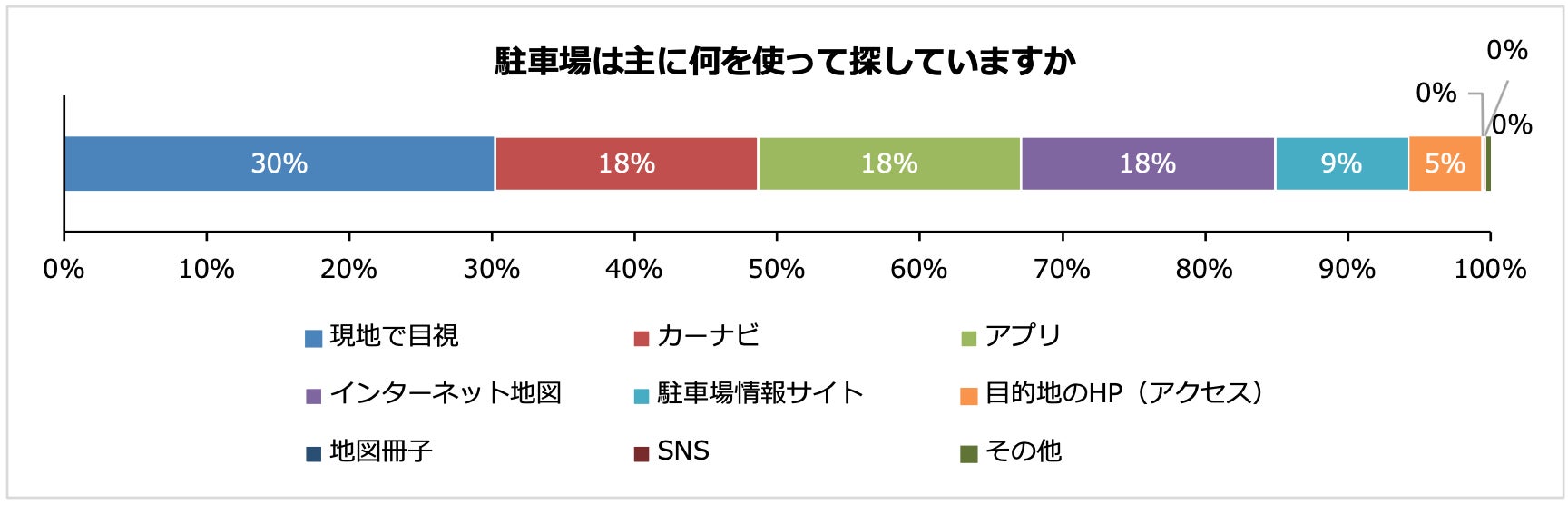 駐車場を探す際、「現地で目視」と回答した人が最多で3割、2位は「カーナビ」「アプリ」「インターネット地図」18%となりました。