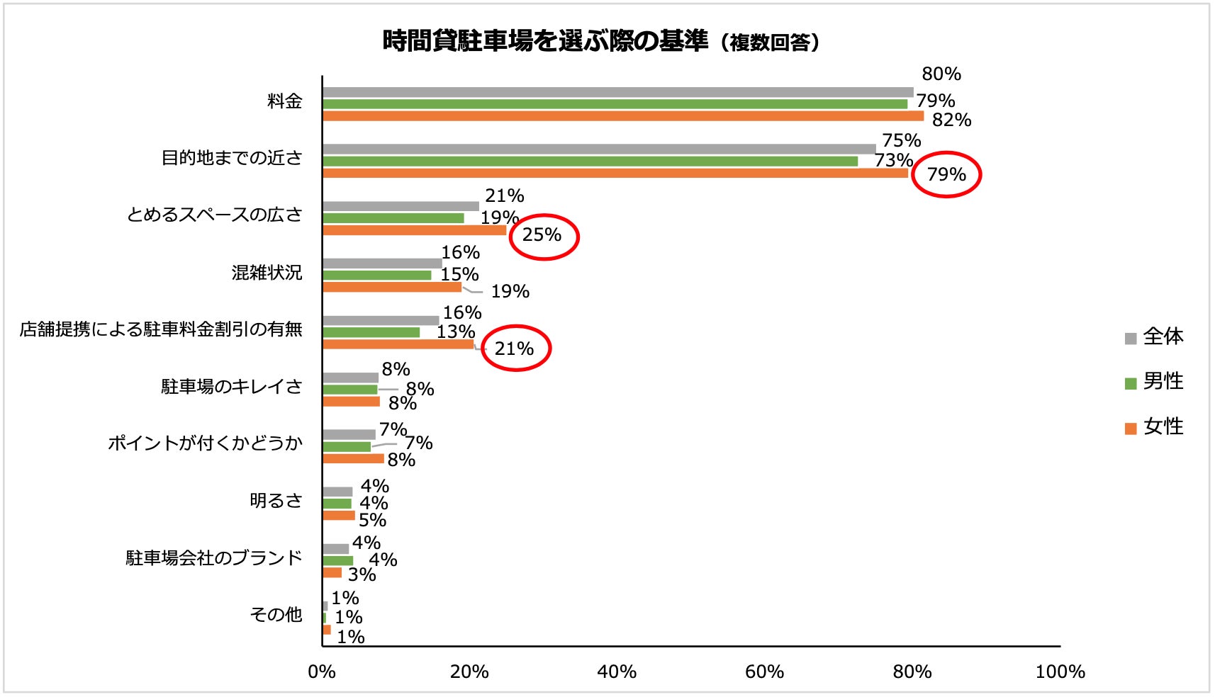 男女別で見ると、女性は男性よりも「目的地までの近さ」「とめるスペースの広さ」「店舗提携による駐車料金割引の有無」が5ポイント以上高くなっています。