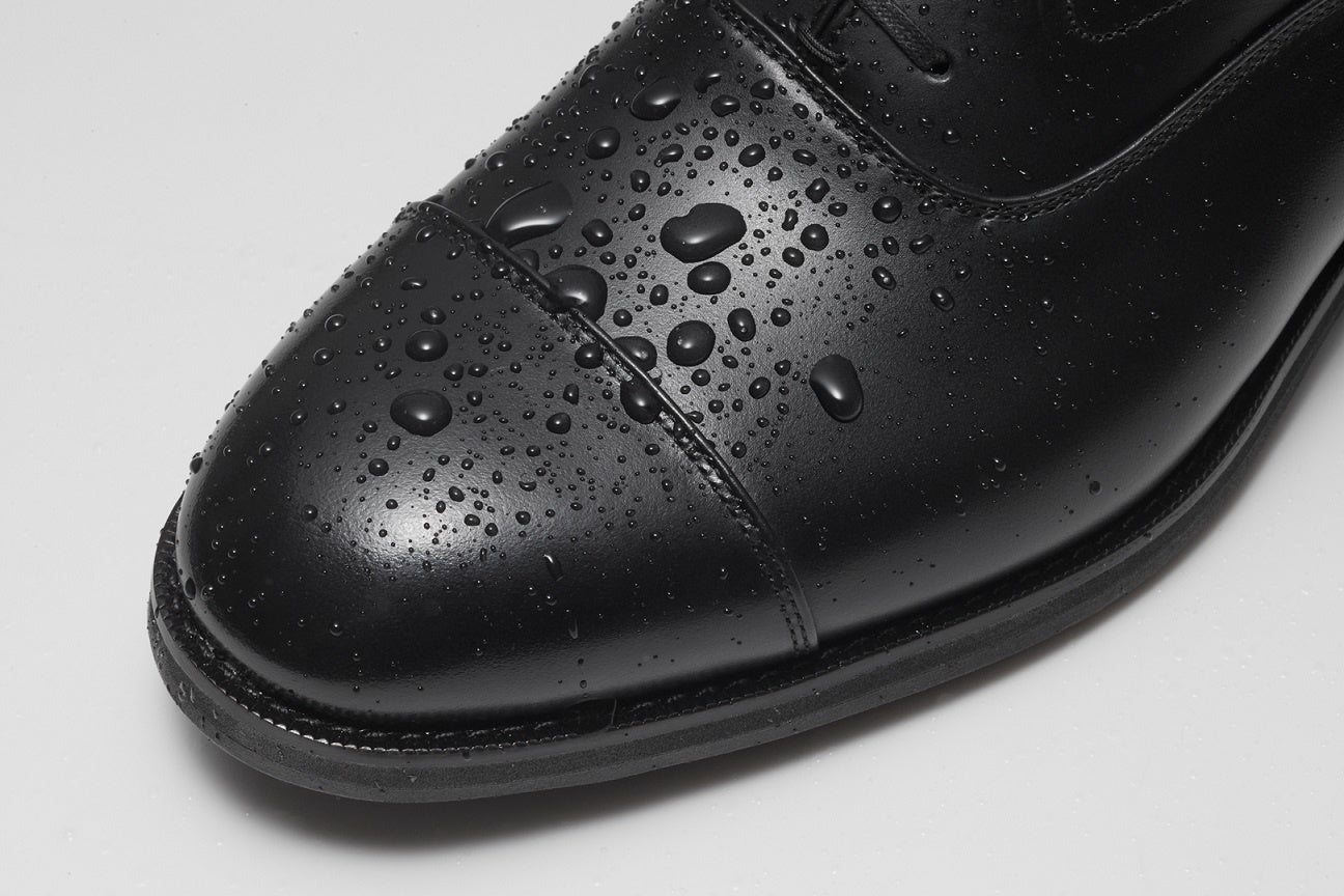 革靴はアッパーが濡れると水ジミや品質劣化の原因になるだけでなく、レザーソールの靴は底から徐々に水が染みて不快感の元になります。本シリーズでは、アッパーに撥水加工を施したレザーを採用し、本革でありながら水を弾き、水濡れに強い作りです。上質感にもこだわり、はっ水レザーとは思えない風合いに仕上げているのもポイントです。ソールはラバー製のため、水が染みてくることがありません。