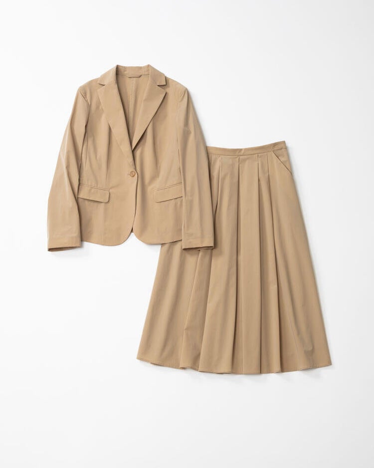 スカートは裾が広がるシルエットがエレガントなデザイン。同素材でパンツ、コートも展開しています。