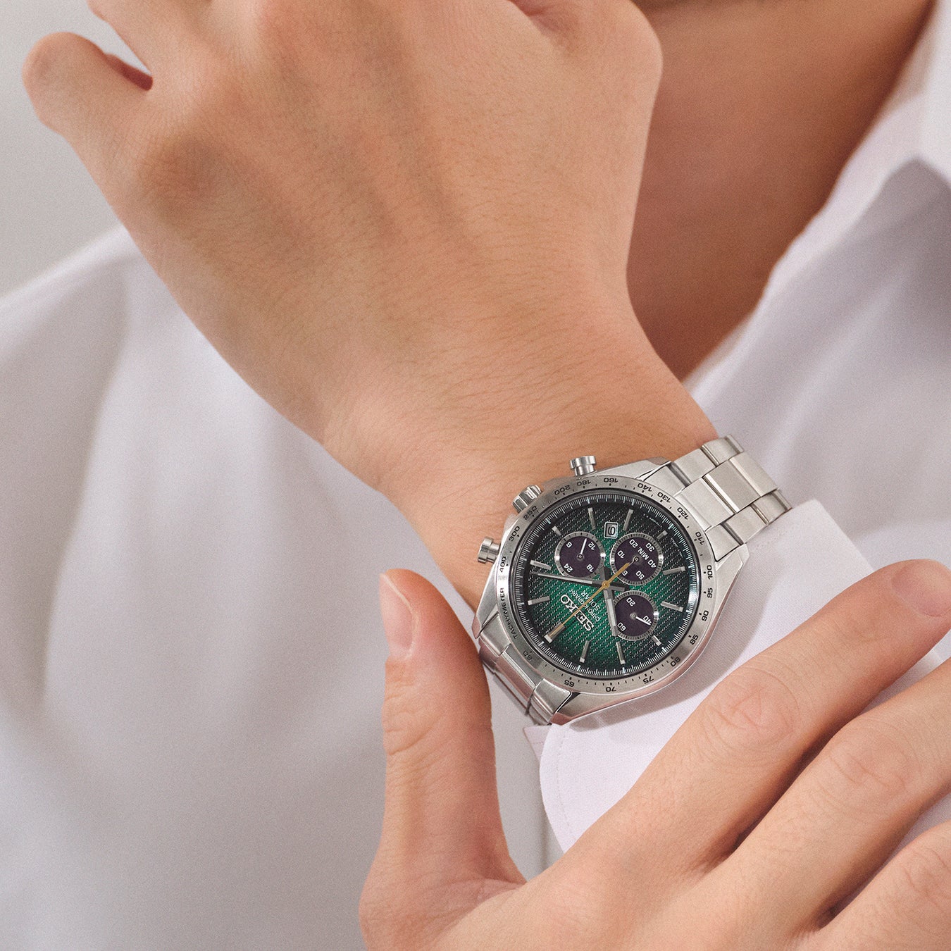 ソーラークロノグラフモデルは、フォレストグリーンのダイヤルに葉の形をモチーフにしたストライプ模様の型打ちパターンを施しました。また、ガラスの表裏両面に光の反射を抑えるスーパークリアコーティングを施し、見やすく、かつダイヤルの質感を際立たせています。