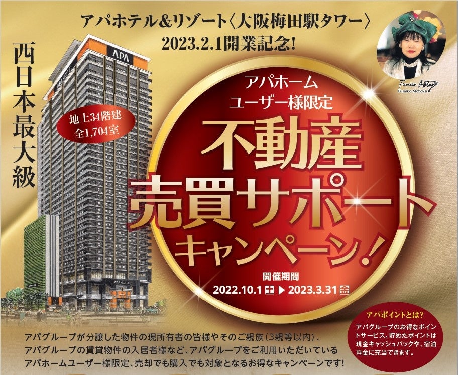 ホテルとマンションを全国展開する総合都市開発のアパグループ(本社:東京都港区赤坂3-2-3 CEO:元谷一志)は、2023年2月1日に開業するアパホテル&リゾート〈大阪梅田駅タワー〉の開業を記念して、2022年10月1日(土)~2023年3月31日(金)の期間に同社が運営する不動産部門『アパホーム』のユーザー様を対象に不動産売買サポートキャンペーンを開催します。期間中に不動産の売買が成立すると最大100,000ptのアパポイントやアパホテル宿泊券等の豪華な賞品がプレゼントされます。