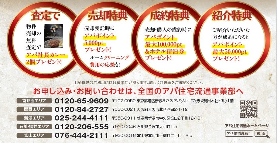 | 特典内容 | 【売却特典】 ① 売却査定を依頼いただくと、アパ社長カレー2個プレゼント ② 売却受託時に、アパポイント5,000ptプレゼント ③ 売買契約成約時に、アパポイント最大100,000ptプレゼントプ ※仲介手数料10万円(税込)につき5,000pt(最大100,000pt) ④ 売出し前のルームクリーニング費用をアパが負担(上限最大5万円) ※売出し価格(税抜)が1,000万円未満の場合 アパ負担額上限3万円 1,000万円以上~2,500万円未満の場合 アパ負担額上限4万円 2,500万円以上の場合 アパ負担額上限5万円 【購入特典】 ① 売買契約成約時に、アパポイント最大100,000ptプレゼント ※仲介手数料10万円(税込)につき5,000pt(最大100,000pt) 【売却・購入 共通特典】 ① アパホテル宿泊券プレゼント(シングル素泊まり1泊・1枚/組) ※対象ホテル:アパホテル&リゾート〈大阪梅田駅タワー〉(開業後)、アパホテル&リゾート〈両国駅タワー〉、アパホテル〈六本木SIX〉、アパホテル&リゾート〈御堂筋本町駅タワー〉、アパホテル&リゾート〈新潟駅前大通〉など 【紹介特典】 ① 紹介いただいた方が成約になると、アパポイント最大50,000ptプレゼント ※仲介手数料10万円(税込)につき2,000pt(最大50,000pt) ※キャンペーン期間中に紹介いただき、3ヶ月以内に売買契約を締結した場合を対象とします。(最長2023年6月30日まで適用) |
