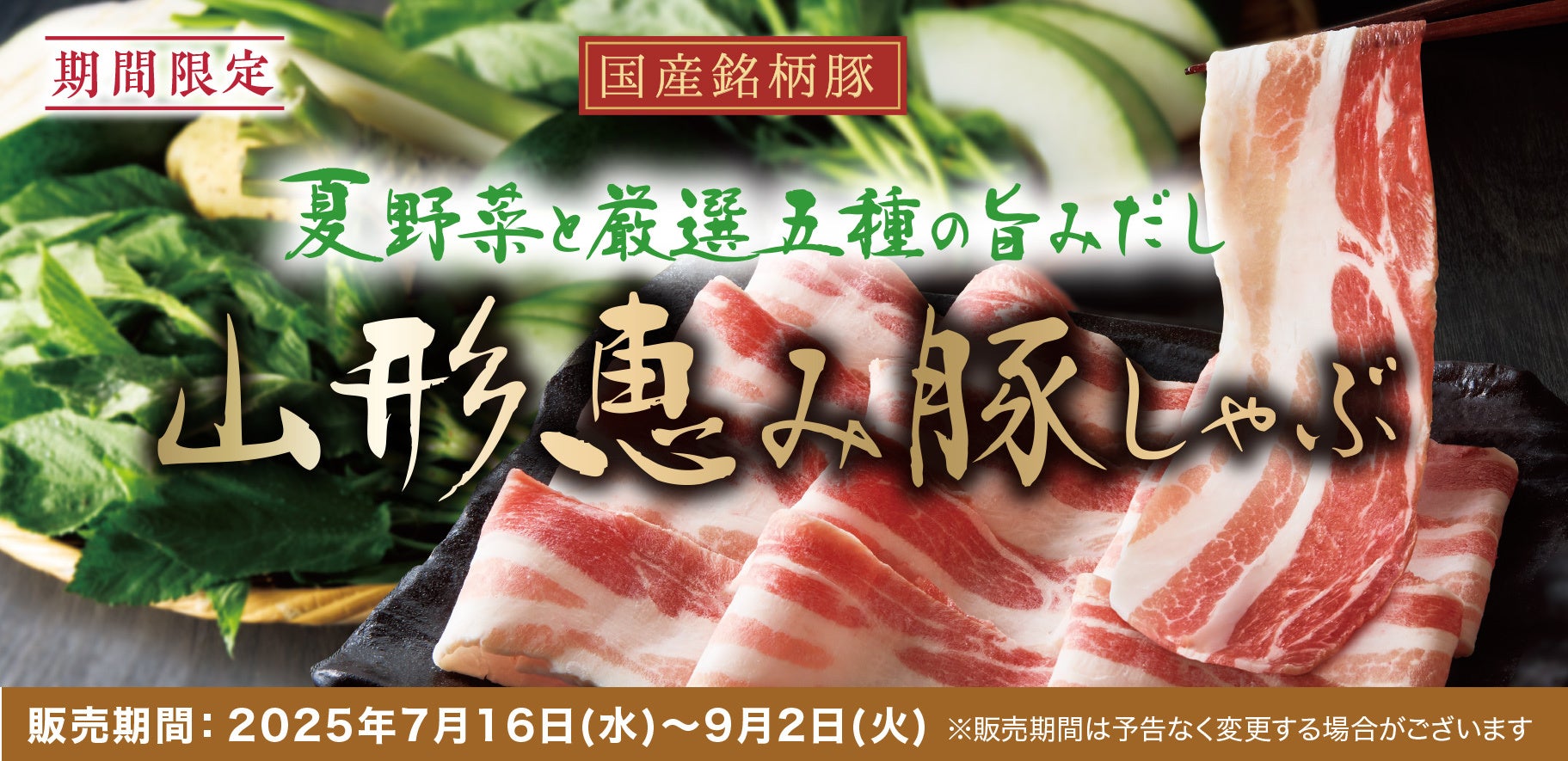 夏鍋第二弾として「夏野菜と厳選五種の旨みだし 山形恵み豚しゃぶ」を2025年7月16日(水)より期間限定で展開します。人気の“夏鍋”をぜひお召し上がりください。