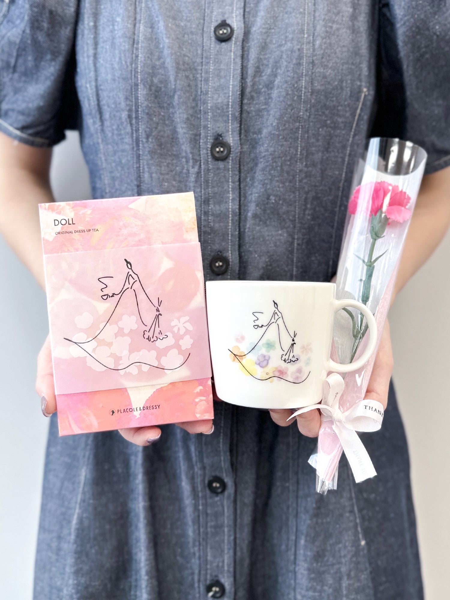 ウェイトドール、オリジナルティー、マグカップのセット。お好きな紅茶を1種類お選びいただけます。4/12〜5/14ご注文分限定で、ラッピングカーネーションをプレゼントいたします。