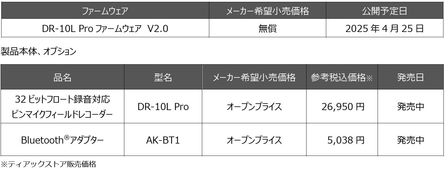 32ビットフロート録音対応ピンマイクレコーダー『DR-10L Pro』タイムコード同期機能において、LTCによるジャムシンクが追加となるファームウェアV2.0を公開