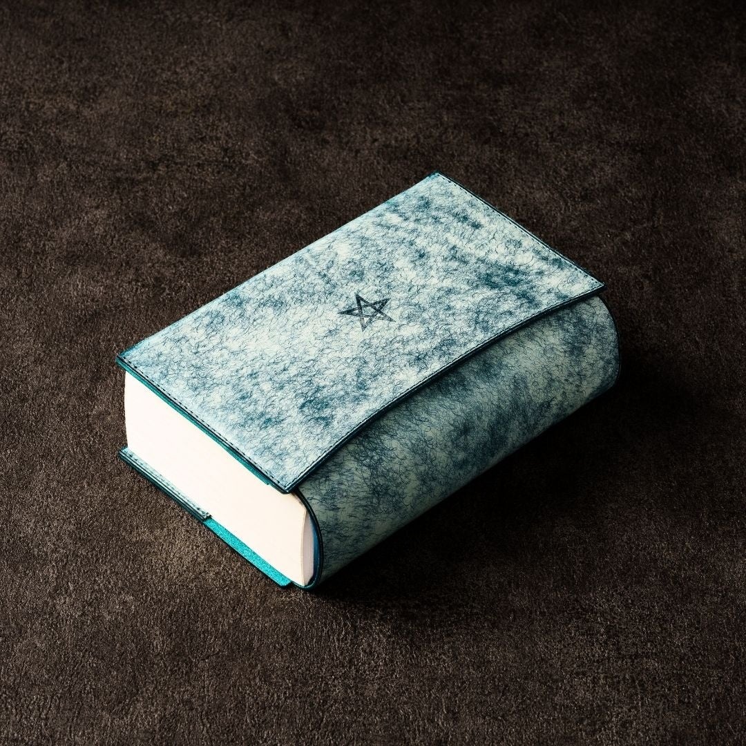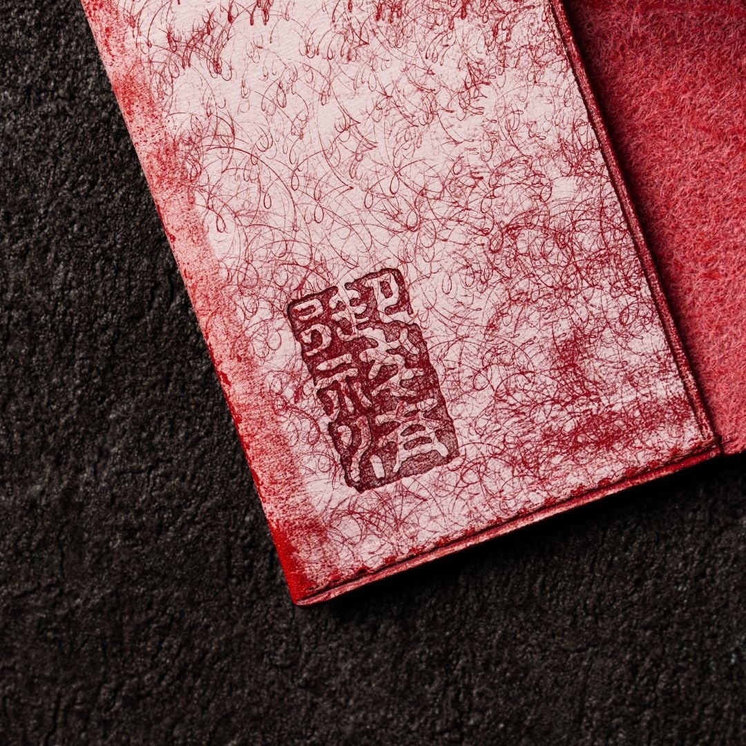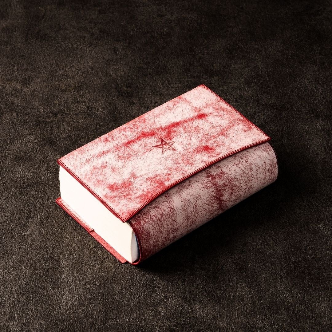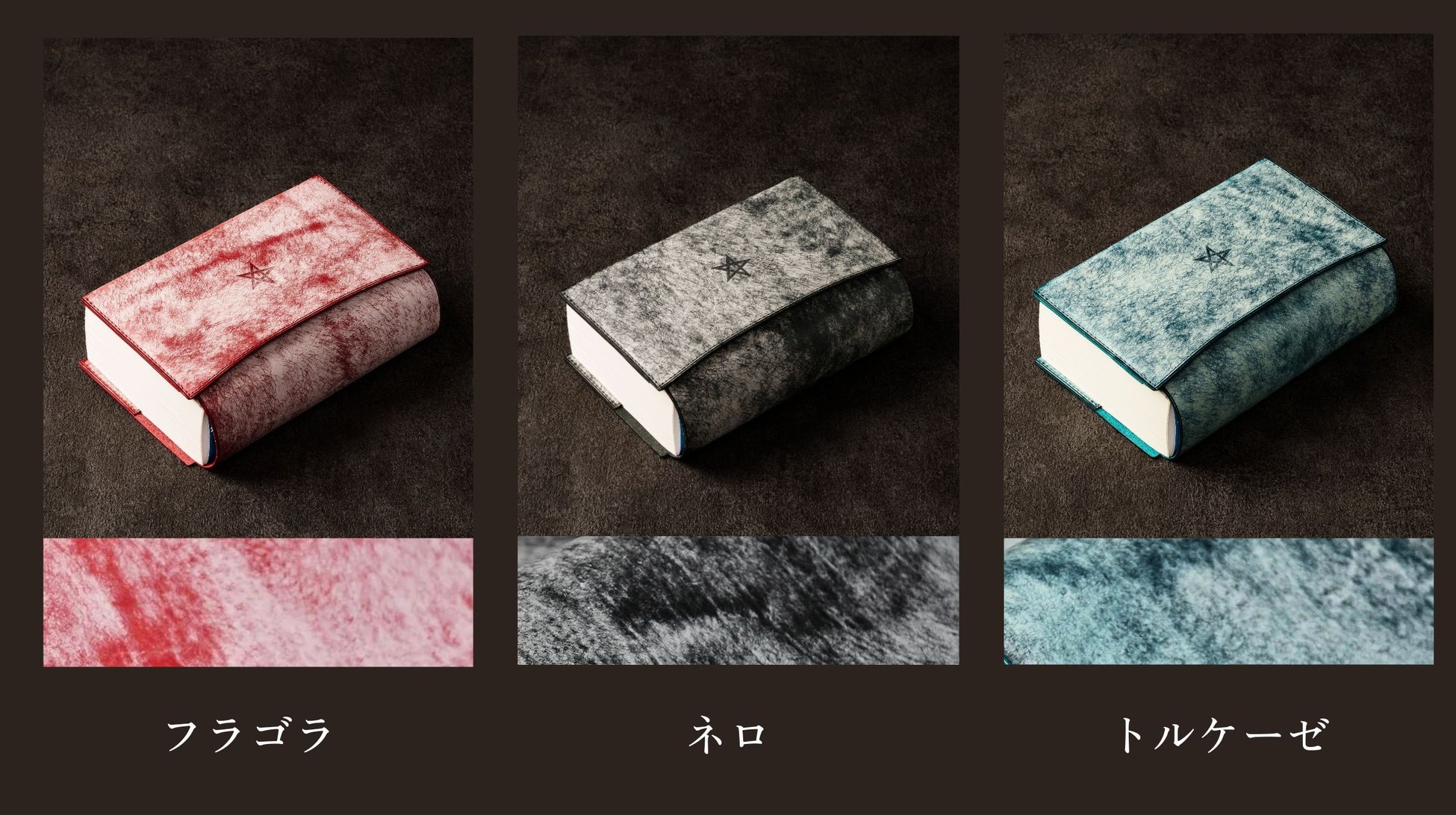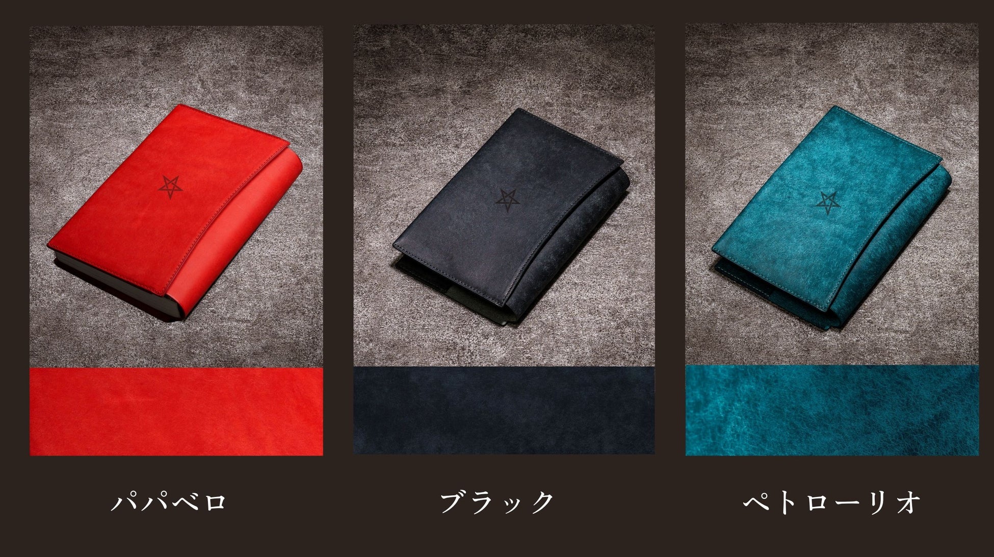 本革ブックカバーには、『晴明桔梗』の刻印と、『御祓済』の刻印を施しています。素材の本革には2種類のイタリアンレザーを用いて京極氏が描く作品の世界を表現しています。