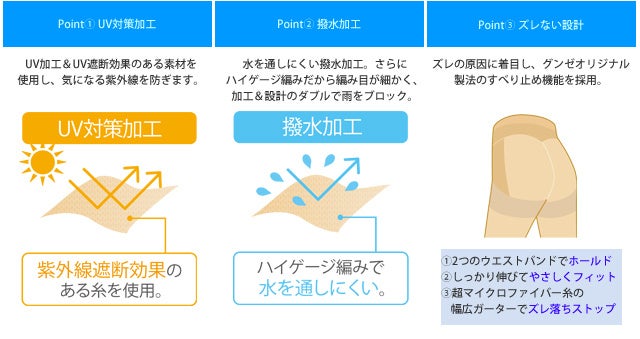 本商品は、晴れの日は気になる紫外線を防ぐUV対策、雨の日は水を通しにくい撥水機能を発揮する天候に左右されることなく快適にはけるストッキング・レギンスです。また、すべり止め機能付ガーター、新立体パンティ部設計、ダブルウエスト設計で、股下のズレを防止します。