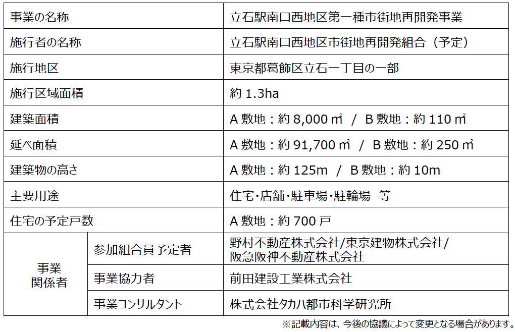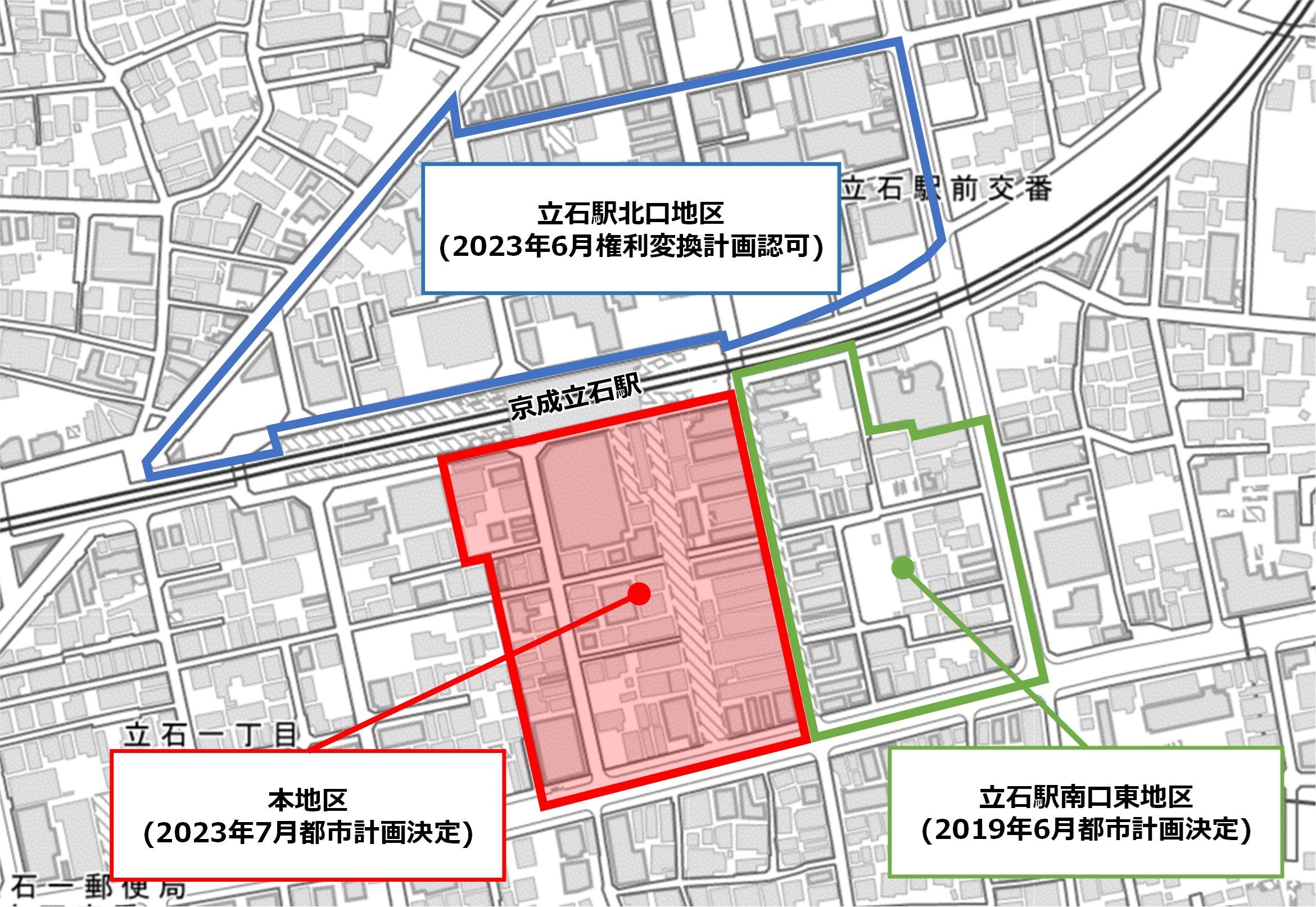 「京成立石」駅周辺では、同線の連続立体交差事業を契機としたまちづくりの機運の高まりを受け、本事業のほか、葛飾区総合庁舎の移転が決定している「立石駅北口地区」、本地区に隣接する「立石駅南口東地区」の再開発事業など、駅周辺を中心に大規模なまちづくりが検討されております。
