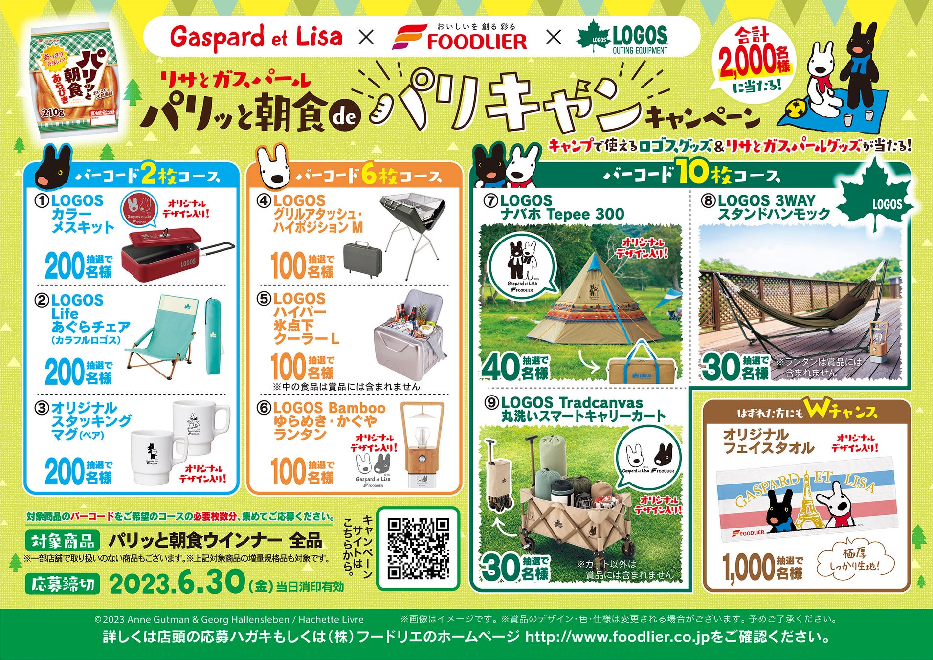 株式会社ロゴスコーポレーション(本社:大阪市住之江区、代表取締役社長:柴田茂樹)が展開するアウトドアブランドの「LOGOS」は、2023年4月1日(土)から6月30日(金)までの期間、株式会社フードリエ(本社:栃木県那須塩原市、代表取締役社長:内田達也)が実施する「リサとガスパール パリッと朝食deパリキャンキャンペーン」にて、コラボレーションいたします。