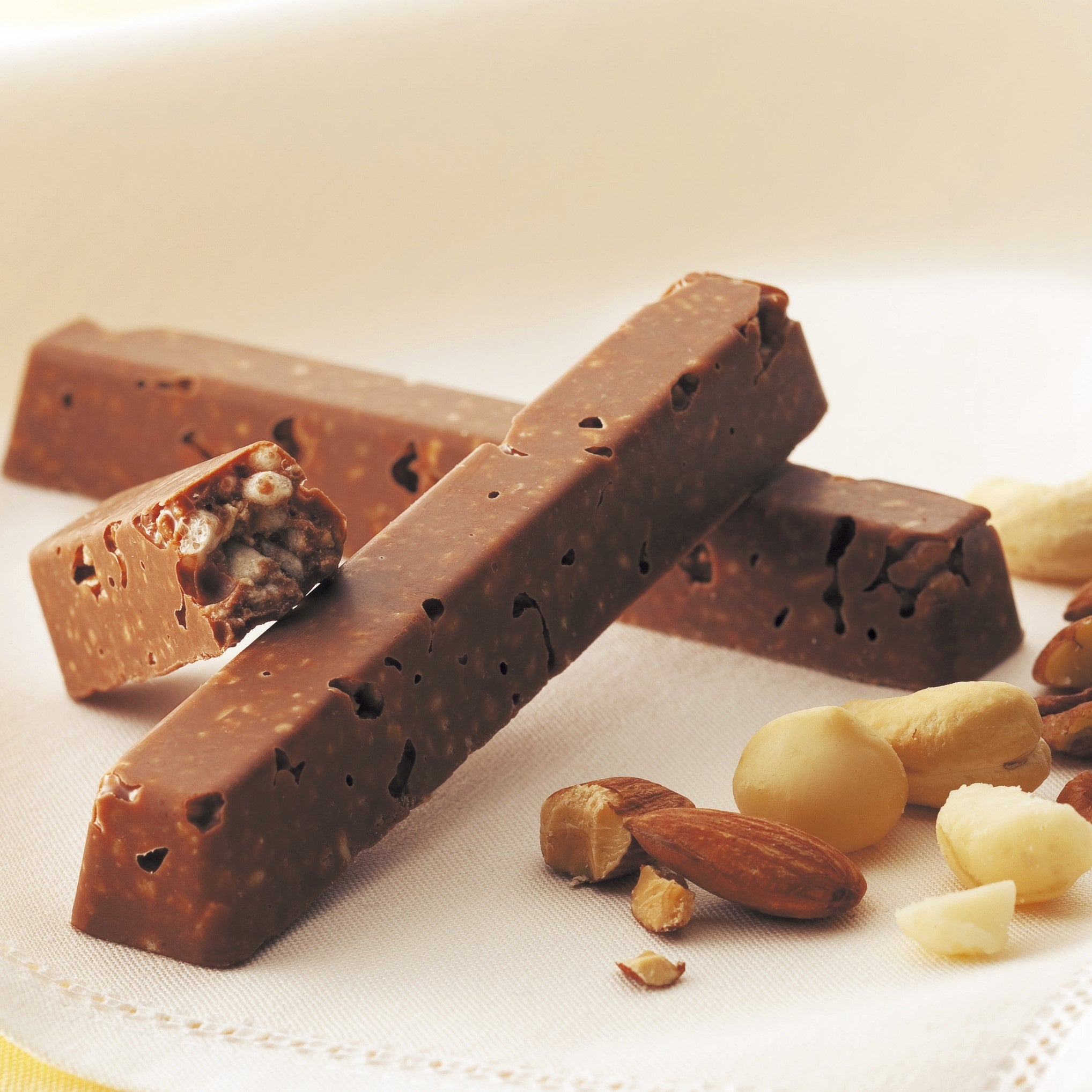 アーモンド、カシュー、ペカン、マカダミアの4種類の砕いたナッツをぎっしり詰めて、アーモンドパフとクッキークランチで軽やかさを出したチョコレートバーの6本セット。チョコレートには、ヘーゼルナッツとアーモンドのペーストを入れてコクを出しました。