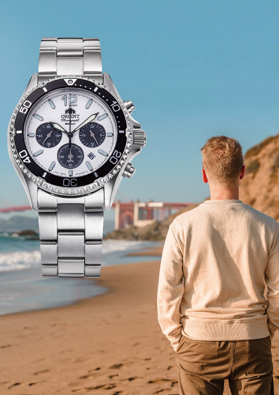 ダイバーとクロノグラフという二つのデザイン要素を併せ持ち、光充電式の利便性も備わる新『オリエントマコ』は、シーンやファッションを問わず楽しめるモデルです。