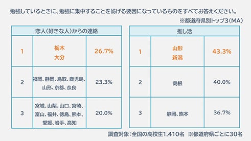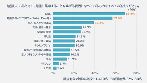 勉強に集中することを妨げる要因となっているものを聞いてみると、「SNS」(68.9%)や「動画サイト・アプリ(YouTube・TVer等)」(57.0%)、「友人・知人からの連絡」(39.3%)など、スマホで見るコンテンツが上位に入りました。また、「推し活」(21.8%)、「恋人(好きな人)からの連絡」(16.2%)など、高校生ならではの項目も一定の数字を集めました。