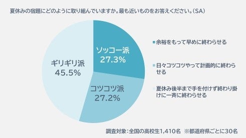 そんな高校生の夏休みの宿題ですが、どのようなスケジュールでやっているのでしょうか。最終日に一気にやったという話もよく聞きますが、そんな「夏休み後半に終わらせる」という“ギリギリ派”は、高校生の45.5%と、半数近い人が該当するようです。