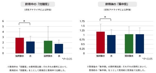 被検者を強炭酸水と水、または、弱炭酸水と水の組合せで飲用する2グループに分類し、飲用前、飲用中、飲用後の脳波を測定し、「覚醒度」、「集中度」を比較。なお、飲用順番は、被験者毎に変えランダム化した。
