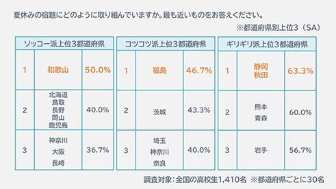 また、これらの結果を都道府県別に見てみると、最も“ソッコー派”が多かったのが「和歌山」で半数の高校生が余裕を持って早めに終わらせると回答しました。計画的に進める“コツコツ派”は「福島」がトップになりました。夏休み後半に一気に追い込む“ギリギリ派”は「静岡」と「秋田」が63.3%でトップになりました。