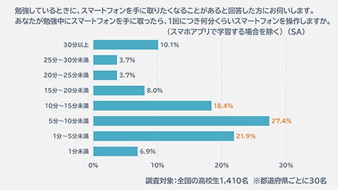 また、そのスマートフォンを勉強中に一度手に取るとどれくらいの時間操作するか聞いてみると、67.7%の人が「1~15分」と回答しました。「30分以上」と答えた人も10%ほどいて、スマートフォンの存在が勉強時間に影響を与えていることがわかります。
