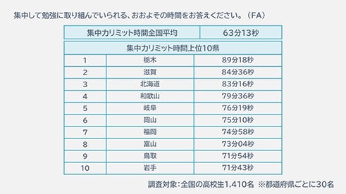 ⑤勉強で集中力が続く時間、“集中力リミット”が最も長い都道府県は「栃木」で89分18秒。全国平均63分13秒の1.5倍の長さ。