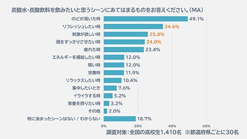 最後に、時代は変わっても高校生が好きな炭酸飲料について、今ドキ高校生に飲みたくなるシーンを聞いてみました。「のどが渇いた時」(49.1%)がトップなのは当然として、「リフレッシュしたい時」(34.6%)、「刺激が欲しい時」(25.8%)、「頭をすっきりさせたい時」(24.0%)など、気分転換をしたいシーンに飲みたいのが炭酸飲料であることがわかりました。