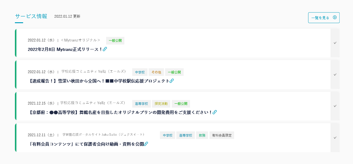 株式会社増進会ホールディングス(Z会グループ)のグループ会社で、教育機関の支援事業を行う株式会社エデュケーショナルネットワーク(本社:東京都千代田区、代表取締役社長:二瓶嘉男)は、必要な教育情報が一覧できるとともに、当社が提供する各種WEBサービスを“シングルサインオン”で連結する学校・学習塾関係者向けの新サービス「Mytranz(マイトランズ)」を2022年2月8日(火)にリリースします。