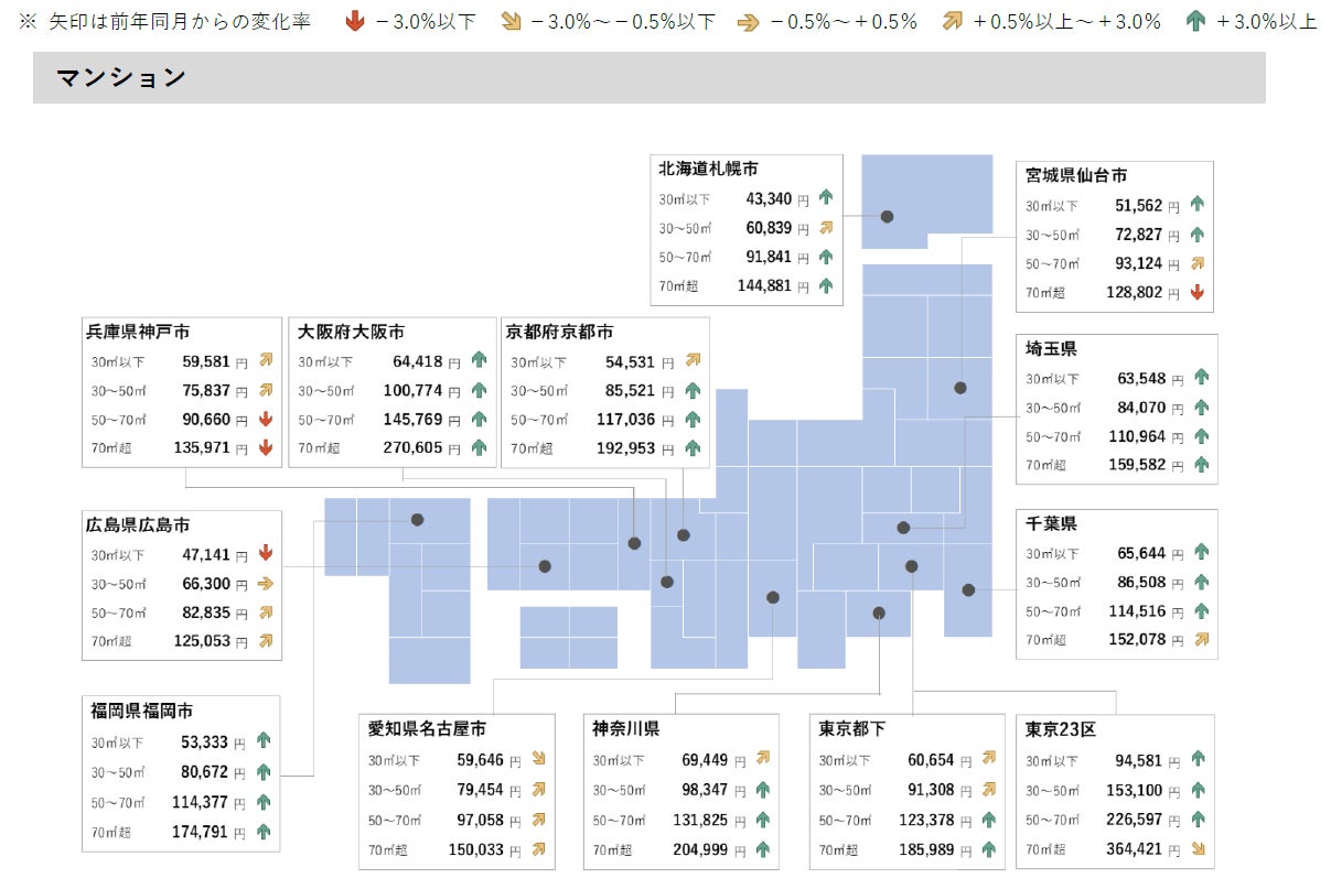 ●マンションは、ファミリー向きが5カ月連続して神戸市を除く12エリアで前年同月を上回る。中でも、東京23区・埼玉県・千葉県・札幌市・福岡市の5エリアは2015年1月以降最高値を更新。