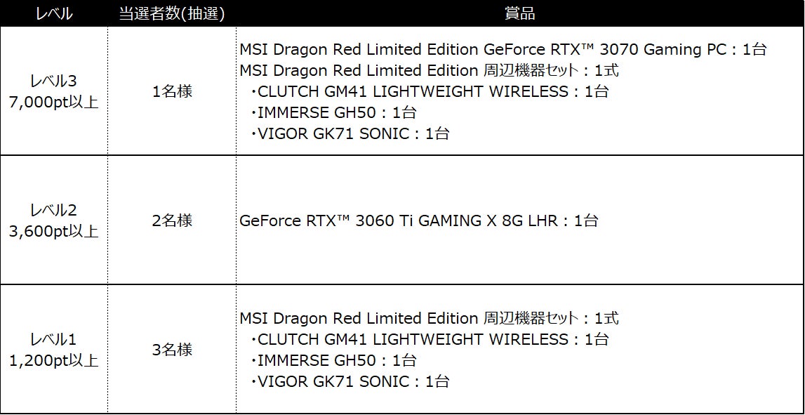 (例:GeForce RTX™ 3060 Ti GAMING X 8G LHRは7,000pt以上獲得すると応募できません。)