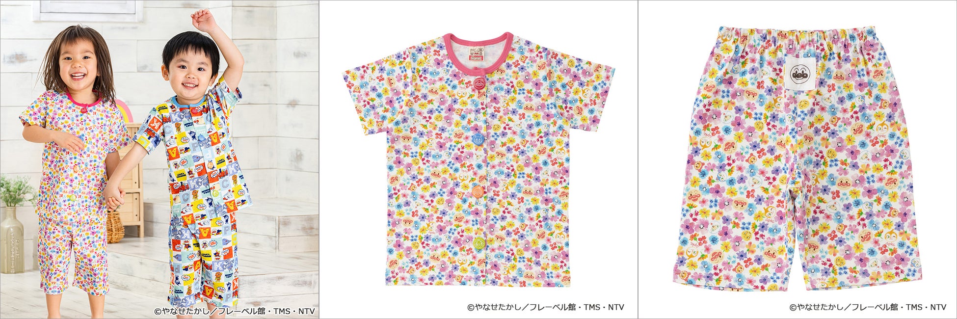 水彩タッチのお花柄の中にアンパンマン・ドキンちゃん・コキンちゃん・メロンパンナちゃん・ロールパンナ・あかちゃんまんがデザインされた可愛らしい総柄と、カラフルなスクエアの中にアンパンマンやばいきんまん・だだんだん・どんぶりまんトリオなどたくさんのなかまたちがデザインされた総柄の2種類です。カラフルなボタンとボタンホールが同じ色になっているのでお子様でもボタンを留めやすくなっています。